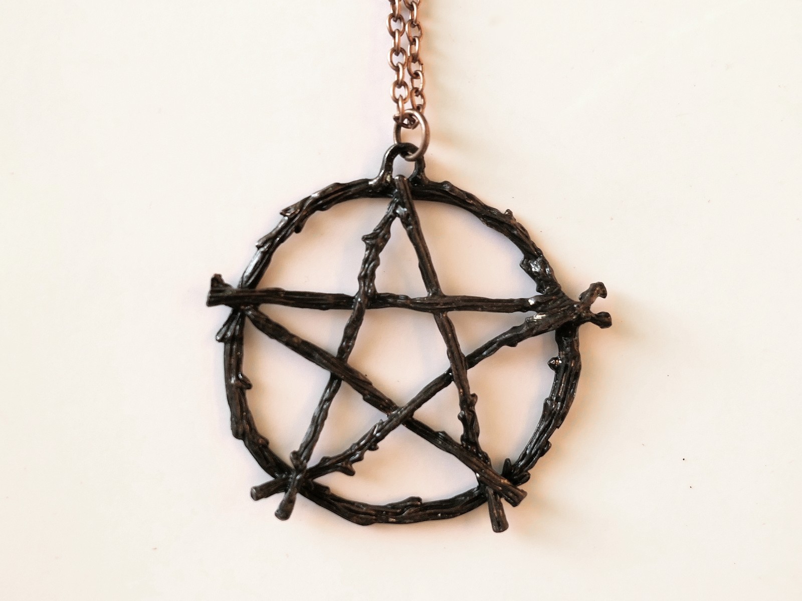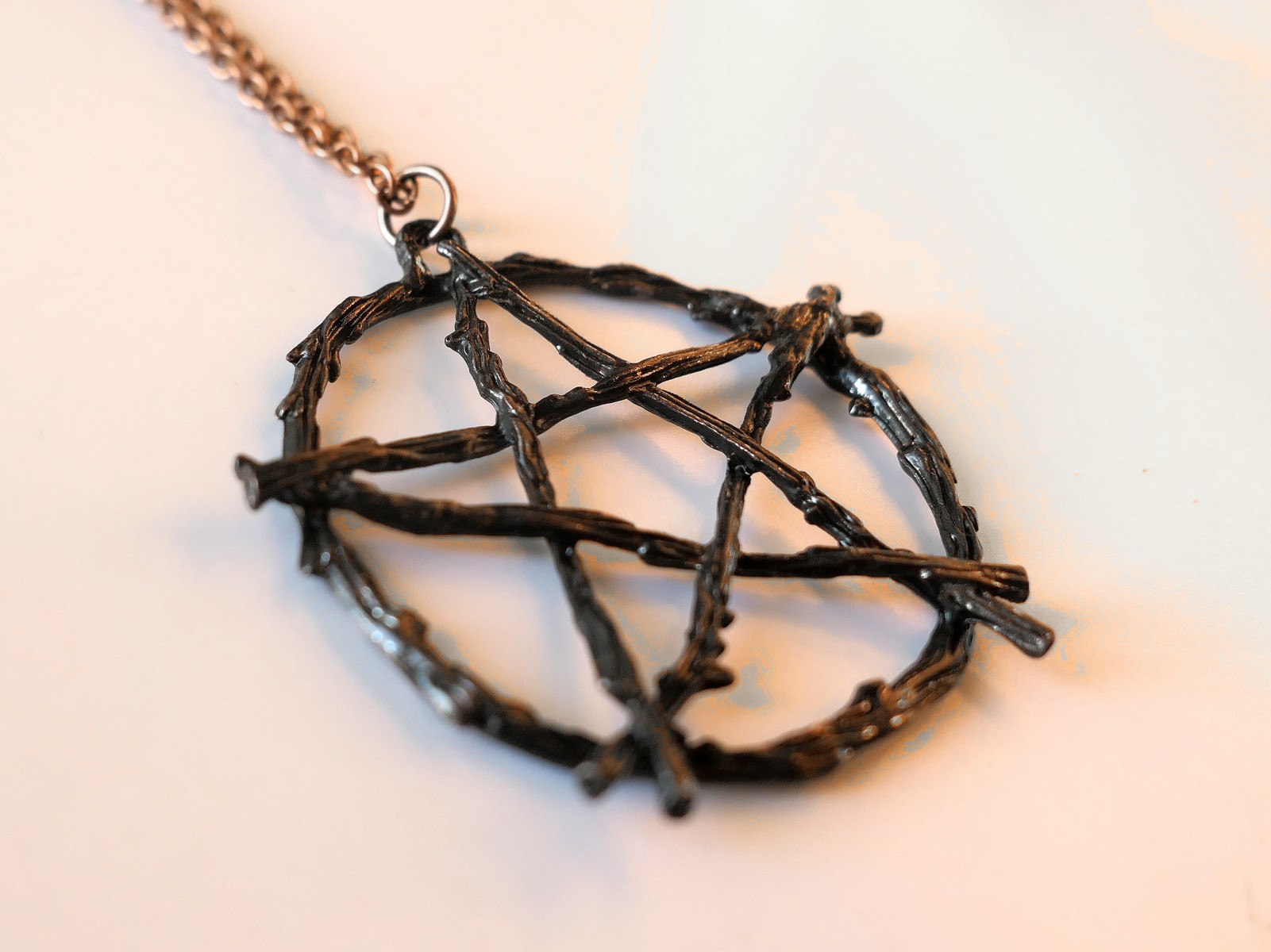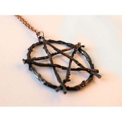Pendentif Pentacle naturel, monté sur une chaîne en cuivre avec une fermeture lobster; style vintage et rétro / gothique / zen. Le Pentagramme est assemblé, plaqué cuivre, patiné, et vernis manuellement. Finition brossée en tons cuivrés vieillis pour garder un esprit nature et mettre en valeur les contrastes. Le pendentif est protégé par un vernis mat transparent, brillant, non-jaunissant, tendu, et indélébile. Pièce unique ou en petite serie. Bijou issu de la collection SORCIERE qui met à l'honneur l’étoile à 5 branches, ou le pentagramme, le symbole le plus commun de la sorcellerie néo-païenne, un ancien symbole de protection contre le mal, de connection des quatre éléments du monde matériel à l’esprit. Porter ce symbole avec la pointe en haut a la propriété d'ouvrir l'esprit aux mystères de la magie.