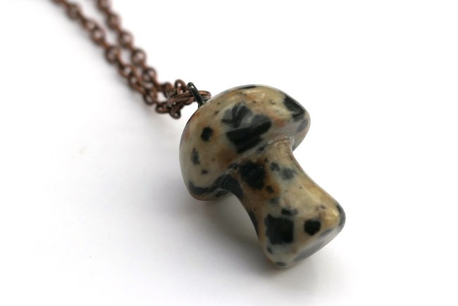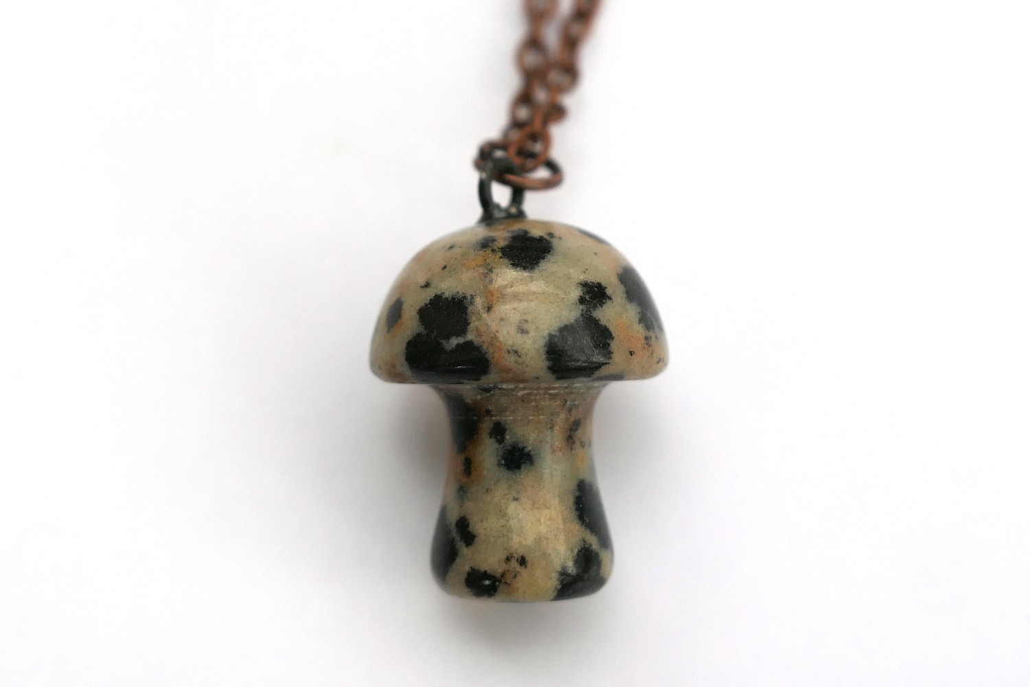 Pendentif Champignon en jaspe leopard, pierre naturelle montée sur une chaine plaquée cuivre; style fantaisie / feerique / goblincore. Le pendentif Champignon est assemblé, patiné, et vernis manuellement. Finition brossée en tons cuivrés vieillis pour garder un esprit nature et mettre en valeur les contrastes. Le pendentif Champignon est protégé par un vernis mat transparent, brillant, non-jaunissant, tendu, et indélébile. Bijou issu de la collection FORET qui met à l'honneur le champignon, un symbole ( notamment en Asie ) de la vie (et parfois de la morte aussi), de la longévité et de la fertilité. Chez les aryens, les vikings, les chamans sibériennes et les sorcières en Europe, l'amanite tue-mouche etait considerée comme un moyen de communiquer avec les esprits et renforcer le courage. La pierre de jaspe supprime les vibrations négatives et apporte force vitale. Il harmonise le corps et l’esprit, apporte la sagesse et le courage.